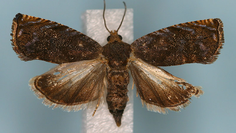 形態(tài)特征:成蟲體長5mm,黑褐色,胸部有籃紫色閃光鱗片,前翅黑褐色;卵扁橢圓形,初產乳白色,漸變黑褐色;幼蟲圓柱形,長9mm,黃色,有透明感,頭部深褐色。蛹黃褐色,長約8mm,臀刺8根。